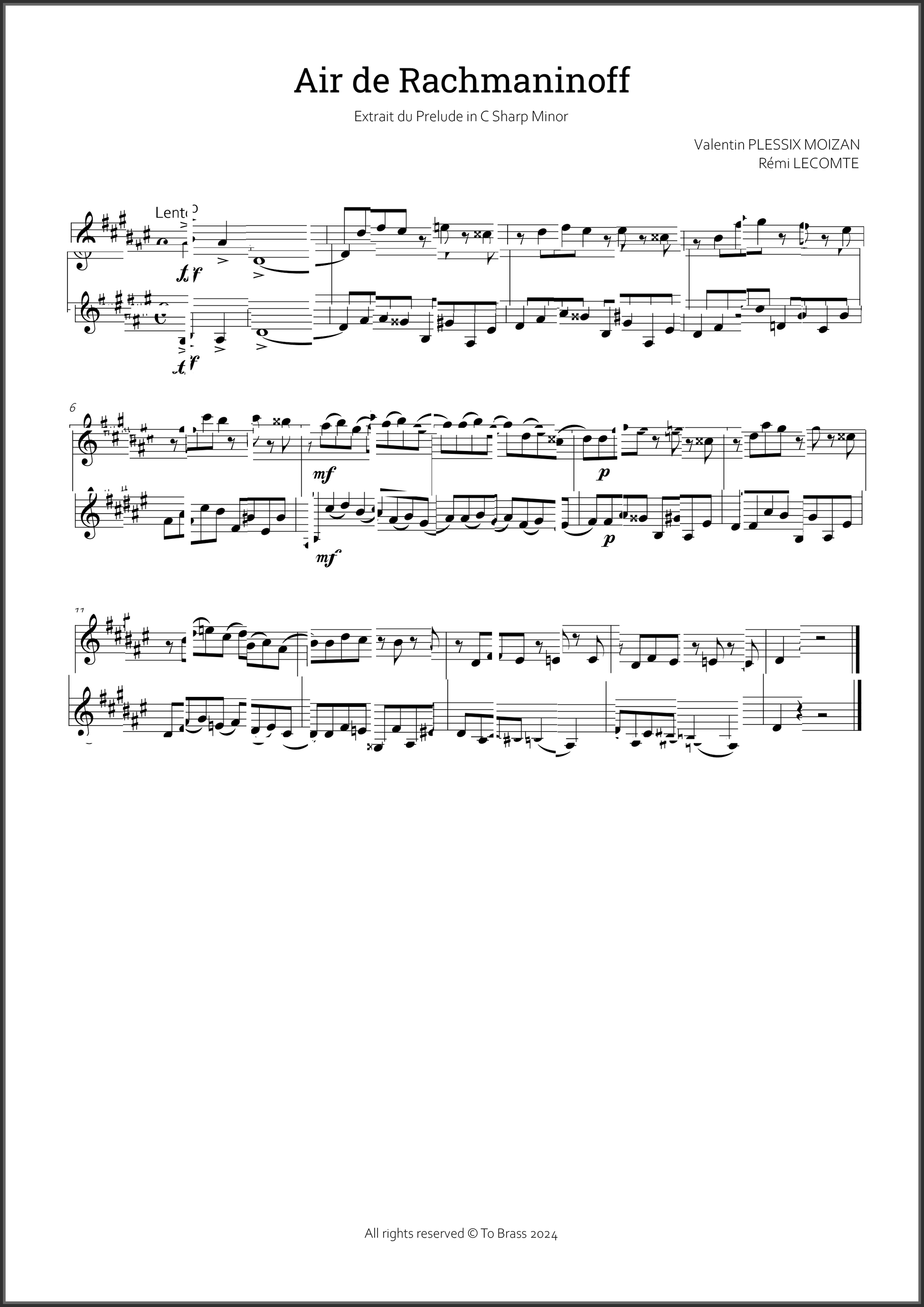 Complete score with separate parts of "Air de Rachmaninoff" arranged by To Brass.